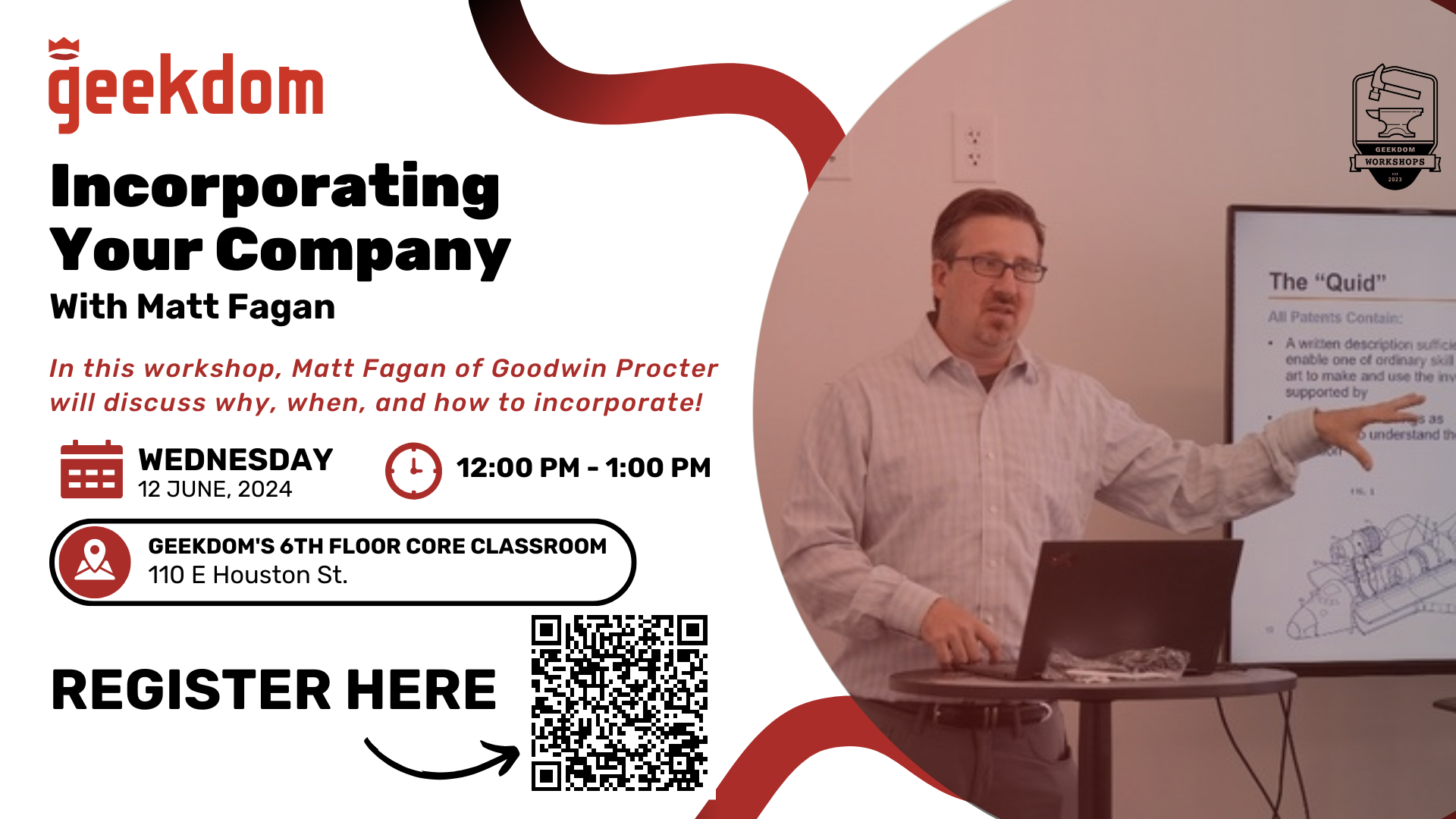 Establishing a legal identity for your business is an important step in the tech company lifecycle. In this workshop, Matt Fagan of Goodwin Procter will discuss why, when, and how to incorporate. We’ll address issues like choosing the correct corporate form (LLC, LLP, S-Corp, C-Corp) and where you can incorporate. We’ll also talk about what documents you need to file and walk through some real-world examples of shareholder agreements, articles of incorporation, and corporate bylaws.